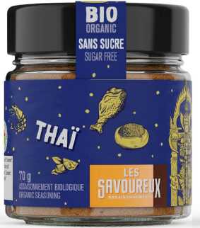 Le mélange d'épices Thaï Les Savoureux vous offre la possibilité de cuisiner des plats variés, parfumés et colorés. La cuisine Thaï est riche et savoureuse. Avec des influences variées en provenance de l'indonésie, du vietnam, du japon et de la chine. Laissez-vous embarquer vers de nouvelles saveurs étonnantes avec des plats typiques comme les fameux pad thaï, le poulet satay, les beignets de crevettes, etc. Aussi, notre assaisonnement Thaï s'intègre très bien dans les marinades, trempettes et vinaigrettes. Ingrédients: Citronnelle*, Sel de mer, Paprika*, Gingembre*, Coriandre*, Farine de coco*, Flocons de piments*, Poudre d'oignon*, Poudre d'ail*. *Biologique. Certifié par OCQV.